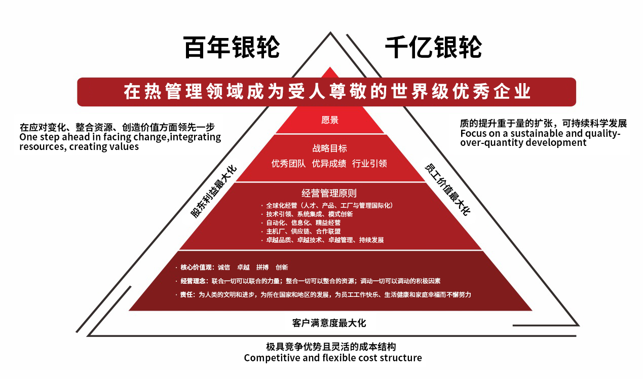 2019—2038年是公司的第二次創(chuàng)業(yè)階段。在這個階段中,銀輪將不斷拓展全球化視野,提升國際化能力,深化體制改革,加強(qiáng)技術(shù)開發(fā),調(diào)整產(chǎn)品結(jié)構(gòu),創(chuàng)新商業(yè)模式,以革命自己的勇氣和決心推進(jìn)銀輪持續(xù)向世界級優(yōu)秀企業(yè)邁進(jìn)。